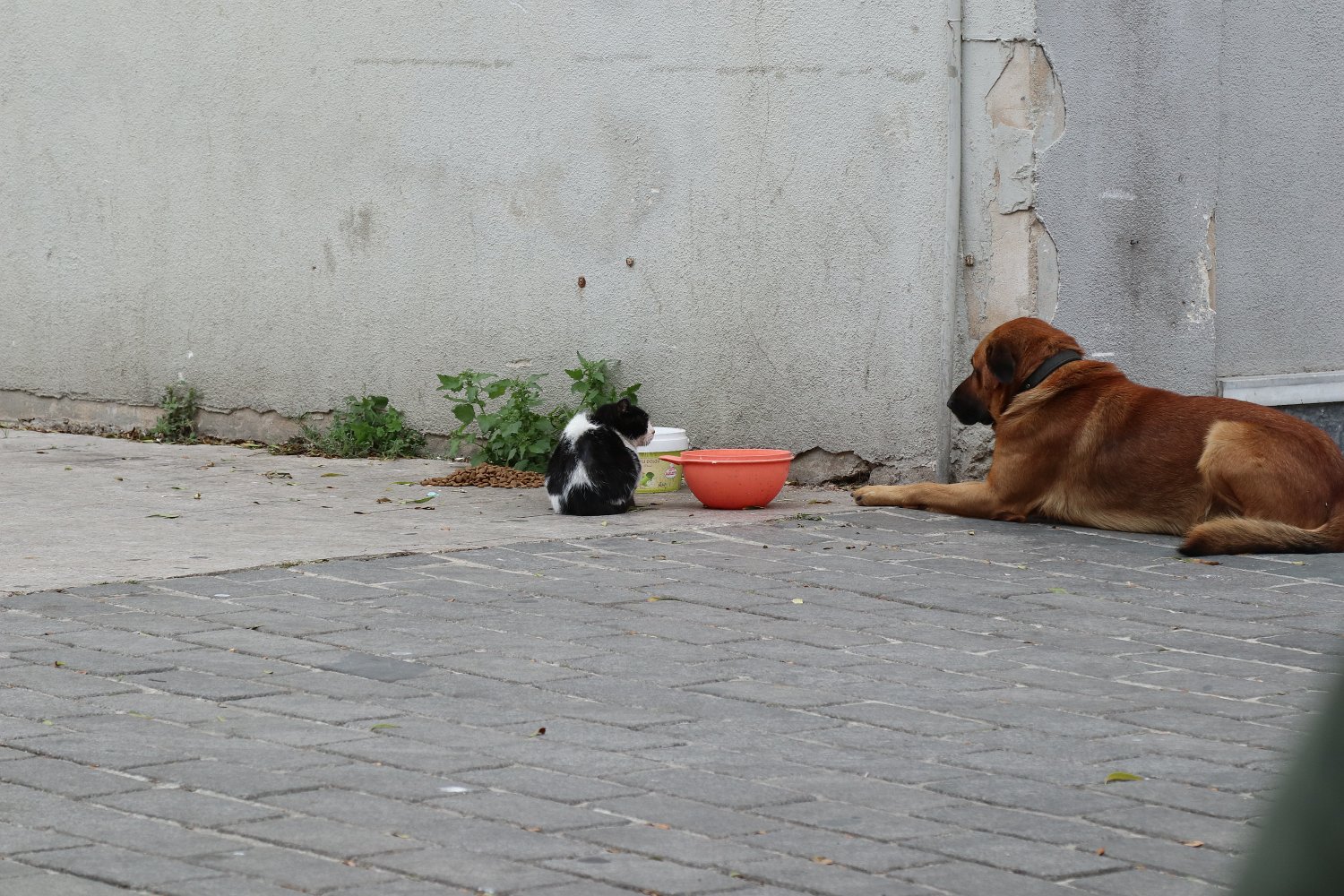 While the dog didn't have any issue with the cat, he didn't want the food stolen by the crow. The cat never saw the crow.